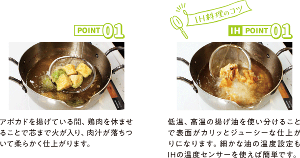 カリッとジューシーな鶏肉とトロッとしたアボカドが甘酸っぱいタレに絡んでごはんにもよく合います。微妙な温度管理もIHに任せておけば大丈夫です。
