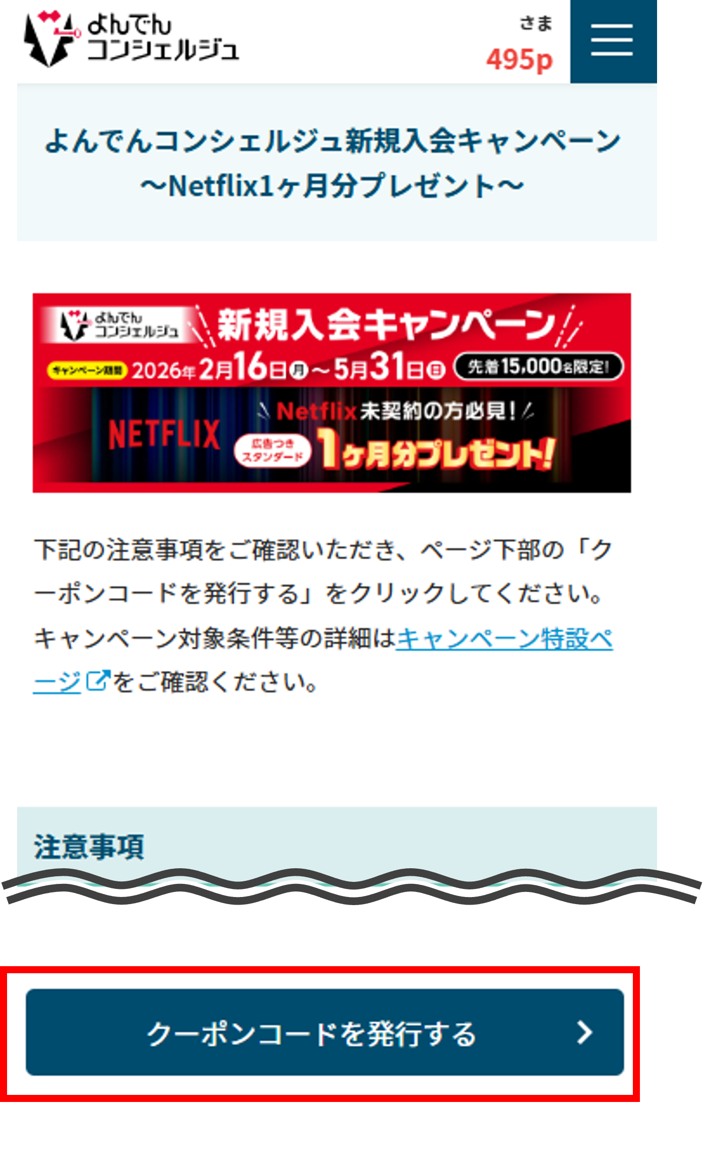 - Netflixクーポンコード受取ページにてクーポンコードを発行します。